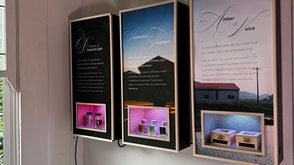 People often ask me what this installation actually is — so here’s the story. It started in Japan as a fragment of an idea. The seed was the apothecary — bottles as vessels, not of remedies but of memory. Not to cure, but to hold. Each fragment a container. Each sound a trace. I began […]